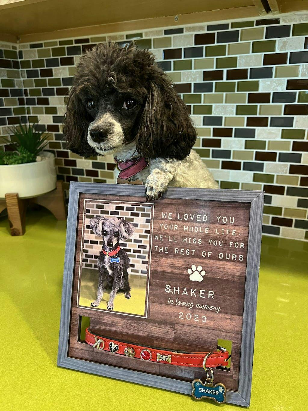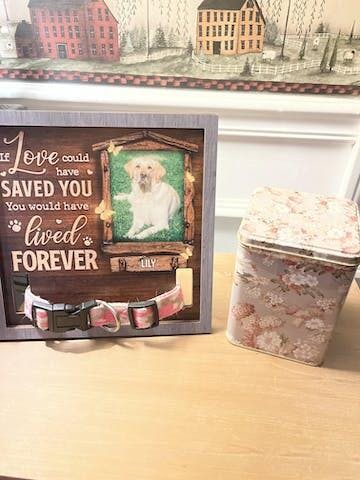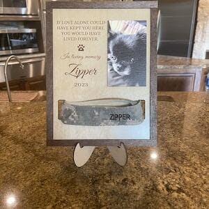 - Losing a pet is never easy. Having a beautiful keepsake to look at every day can help ease that grief a little bit. Customized with your pet's name and a spot for your favorite picture of them. The sign features a space to display their collar.