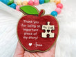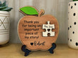 The teacher's title and year 2023 are engraved on the puzzle piece that is mounted on the apple shaped sign.