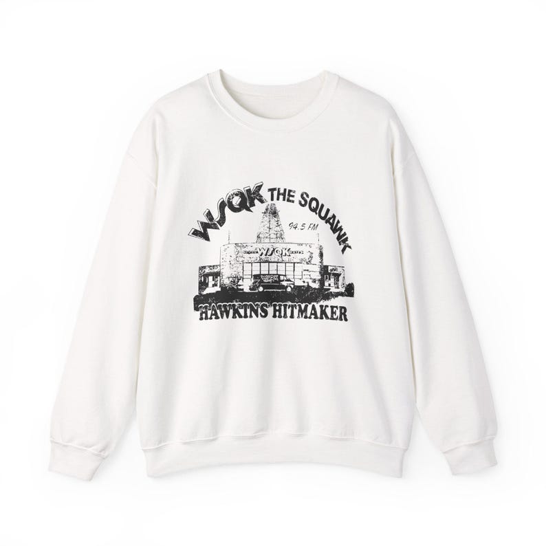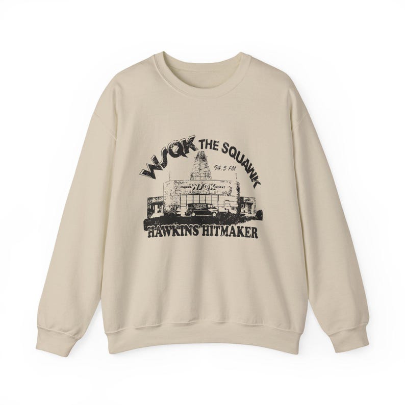 ST Radio Station WSQK "The Squawk" Hawkins Hitmaker Sweatshirt in Heather Gray, White, and Sand